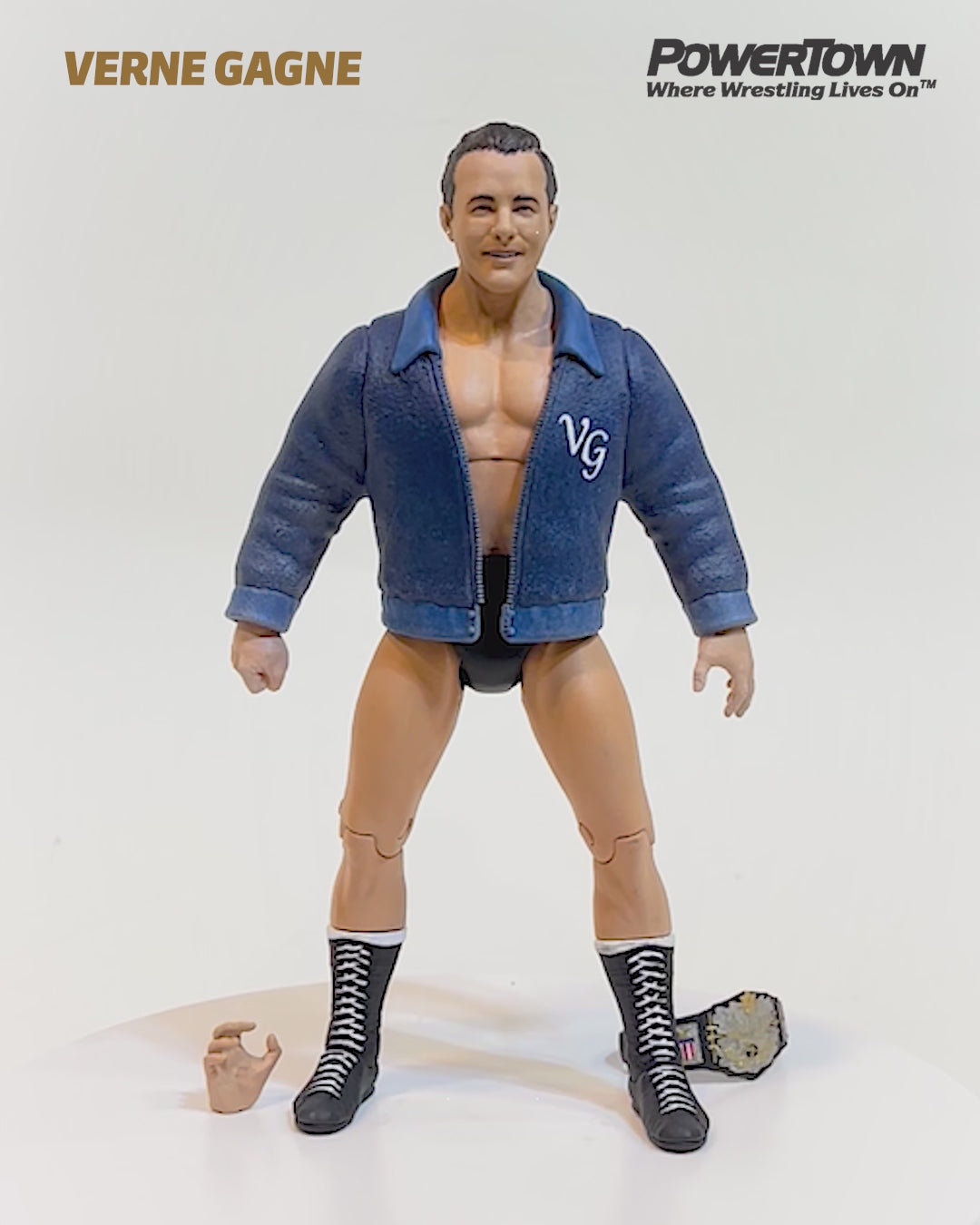 Alternate hand, replica title belt, neck towel, and removable "VG" jacket.